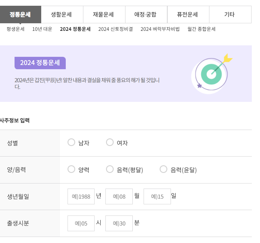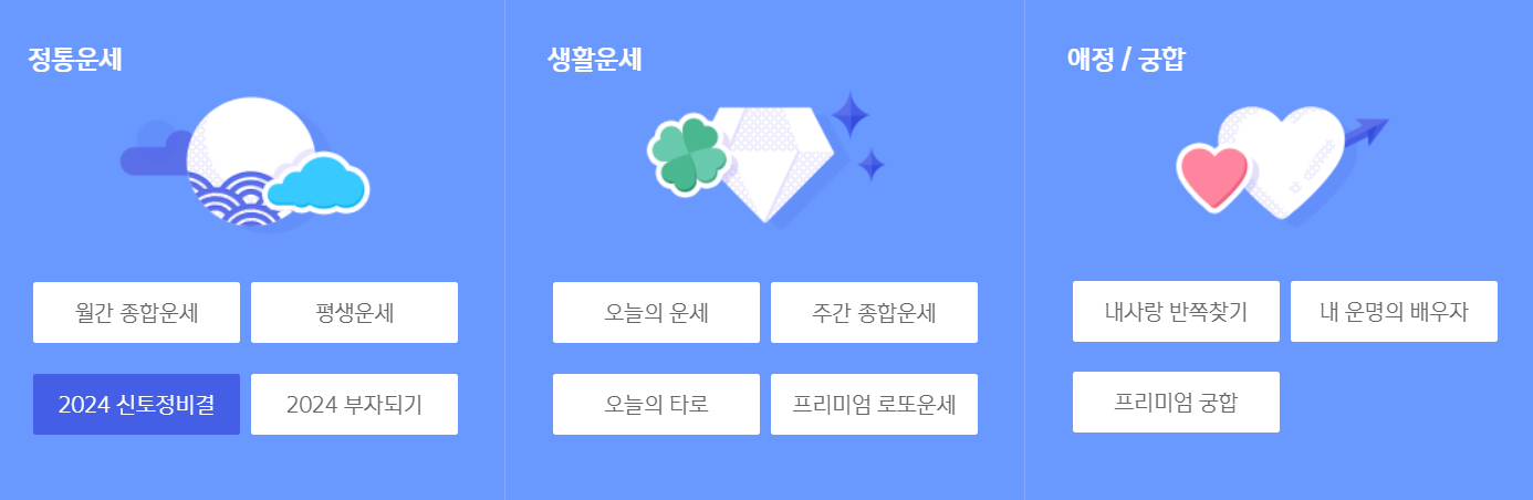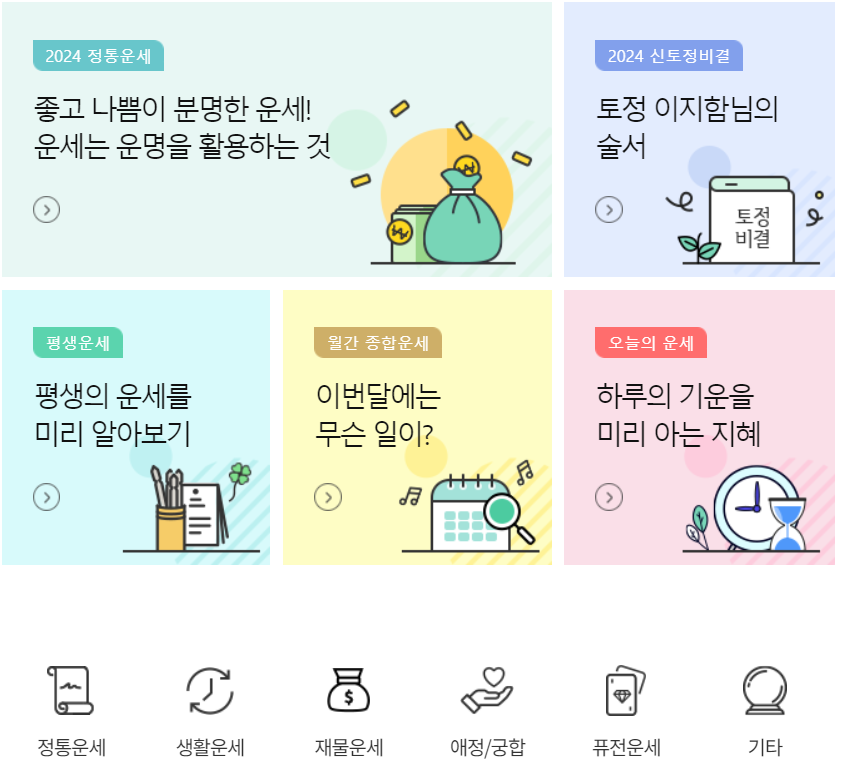 농협 사이트에서 2024년 신년운세, 토정비결, 월간 운세, 오늘의 운세등을 무료로 볼 수 있습니다.