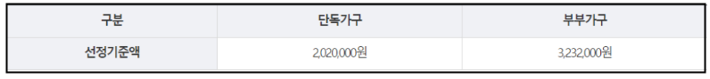 · 소득인정액은 단독가구와 부부가구에 따라 각각 2,020,000원 및 3,232,000원으로 설정되어 있습니다.
