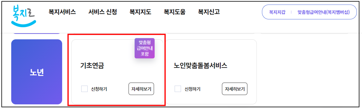'서비스 신청'을 클릭하고, 노년의 기초연금 신청 항목을 선택합니다.