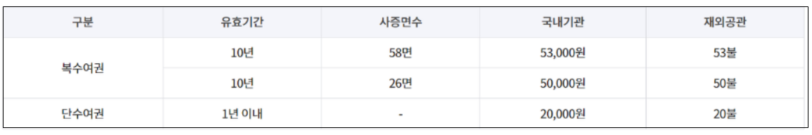 여권 발급 비용은 종류와 유효 기간에 따라 다르며, 예를 들어 복수여권의 경우 유효 기간이 10년이고 26면 사용 시 50,000원의 수수료가 부과됩니다.