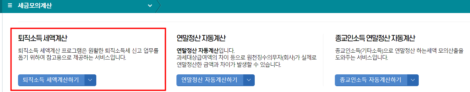 세금 계산은 너무 복잡하기 때문에 홈택스에서는 몇 가지 정보를 기입하면 자동으로 모의 계산 해주는 서비스를 제공하고 있습니다.