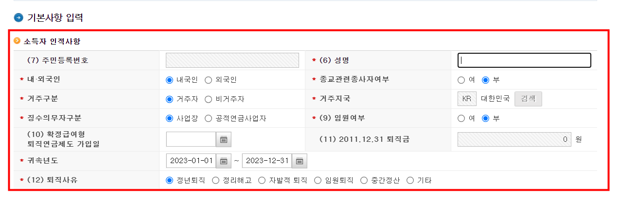 ② 퇴직소득 세액의 필요 해당 연도 클릭