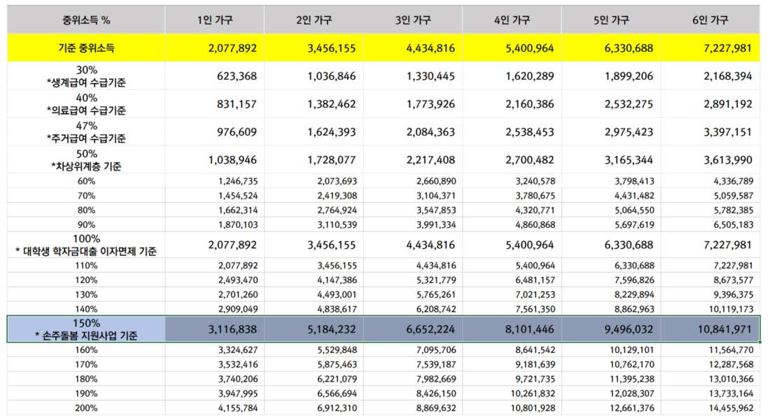 2023년 기준 중위소득 100%, 150% (2인가구 등)
