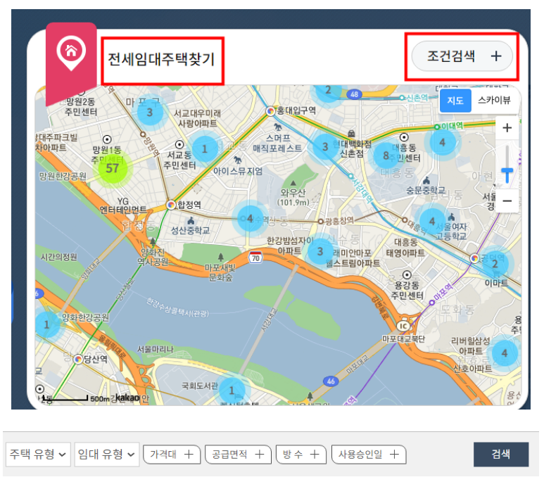 지역, 주택 유형, 임대 유형, 가격대, 공급 면적등으로 조건 검색이 가능합니다.