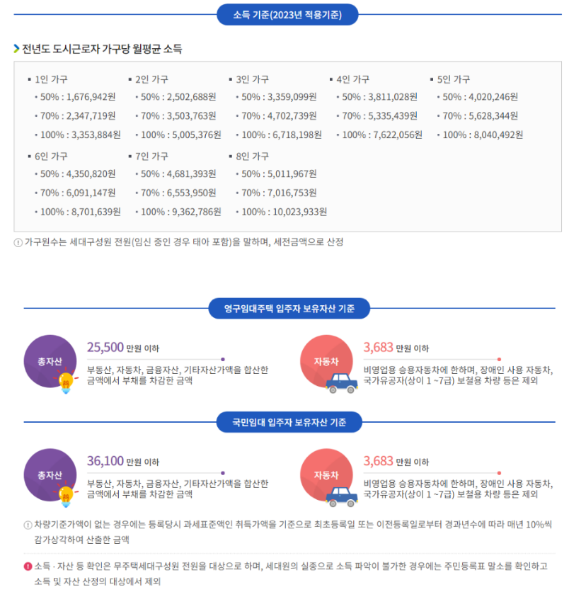 세대 구성원은 모두 무주택자여야 하며,  세대의 월평균 소득기준으로  전년도 도시근로자 가구당 월평균 소득의 50% 이하여야 합니다.